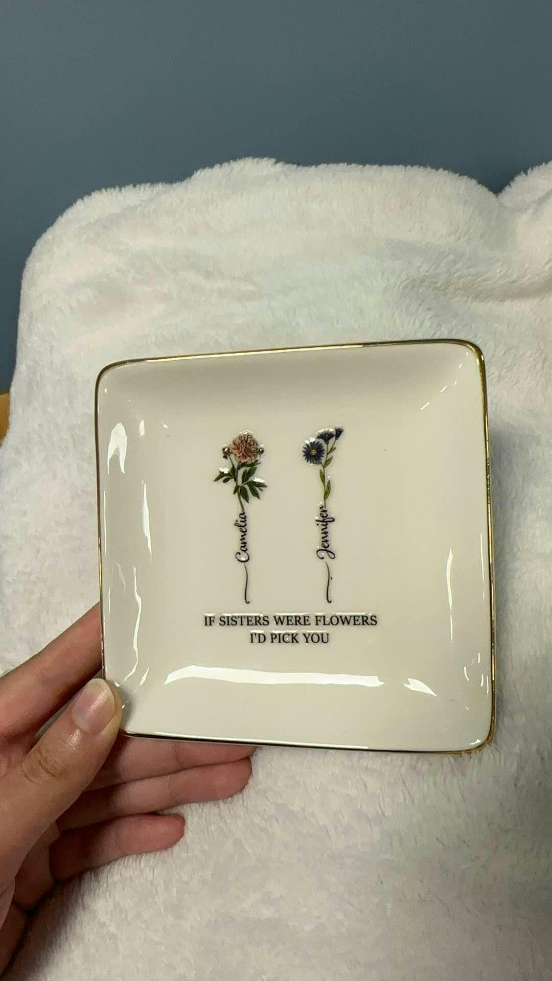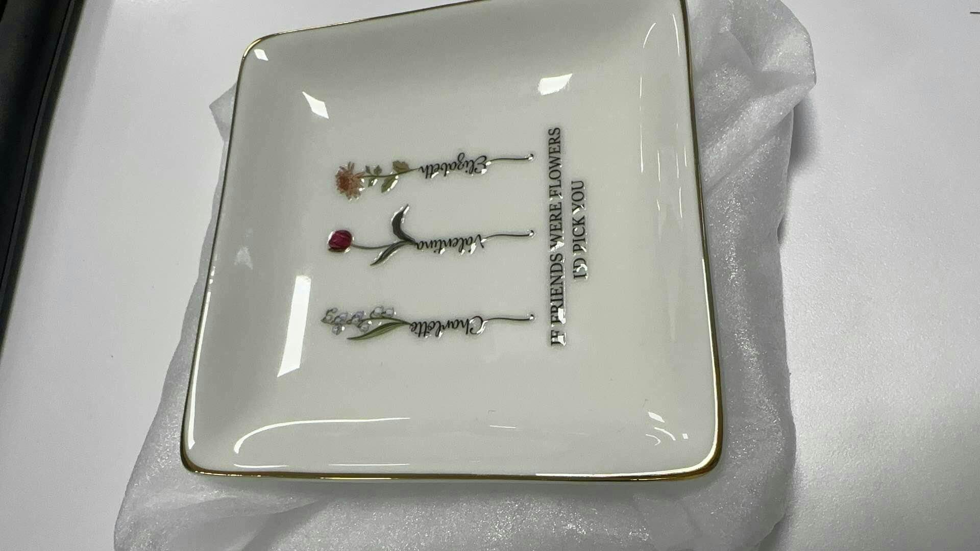 Each dish is delicately designed with elegant floral illustrations and customizable names, creating a one-of-a-kind piece that’s both meaningful and beautiful. Crafted from high-quality ceramic with a soft sheen and gold-trimmed edges, it’s perfect for holding jewelry, keys, or other small treasures — a daily reminder of a friendship that blooms with care and joy.